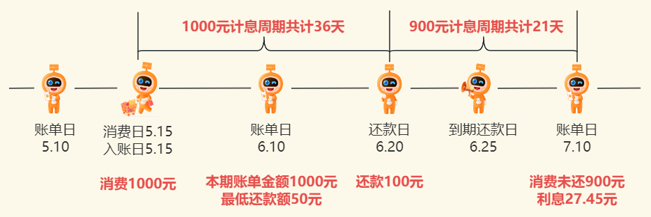假如该客户在5月15日刷卡消费入账1000元,6月10日出账单(账单“本期账单金额”为1000元,“最低还款额”为50元),最后还款日为6月25日。若持卡人于6月20日偿还100元(未小于最低还款额,不计收违约金),在7月10日出账时,总共会计收27.45元的利息。利息具体计算如下: